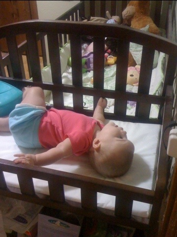 One of my tiny darling’s nicknames for awhile now has been “the daddy stalker.” She is so infatuated with Ben, it’s hilarious! She has recently also become quite curious about the animals, especially as seen above, when we’re putting her in her car seat and they’re above her. She has very obviously made it her mission to put their tails in her mouth at the quickest available moment when she is in the exersaucer or bounce bounce baby.