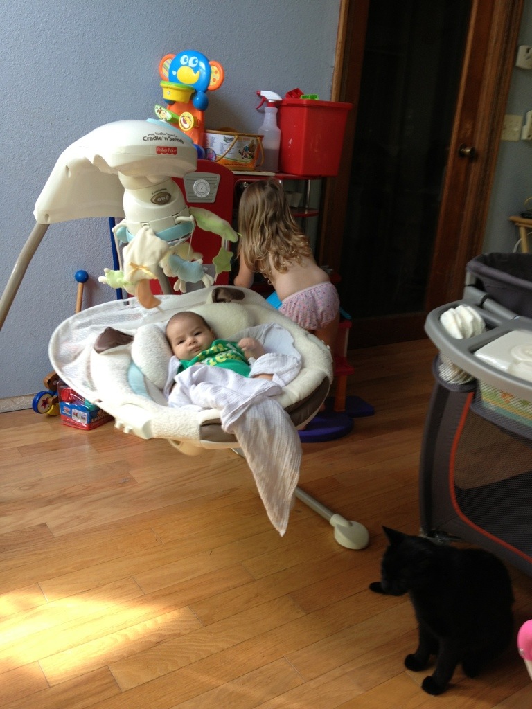 Nora sounds pretty annoyed by my question, which conveys to me that she woke her up by prodding and poking, and duh, the baby is crying. I tell her to pat the baby’s belly and she runs off. A couple minutes pass…